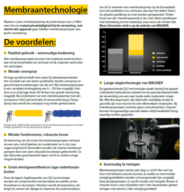 - Minder overspray - De membraanpomp is instelbaar tussen 0 - 250 bar. Vooral de lage spuitdruk (30-40 bar) geeft bij spuiten van lak een verrassend mooi spuitbeeld, gecombineerd met minder overspray en een perfecte controle. Bij plunjerpompen krijg je op zo'n lage druk een onregelmatiger spuitbeeld.